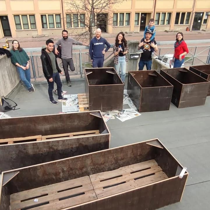 volontarie e volontari che si prende cura dello spazio verde attraverso l’autocostruzione di arredi con materiali di recupero, con la coltura di piante ornamentali ed edibili, con l’attuazione di laboratori rivolti alle scuole primarie e con la continua progettazione di nuove attività da svolgere all’interno dello spazio.